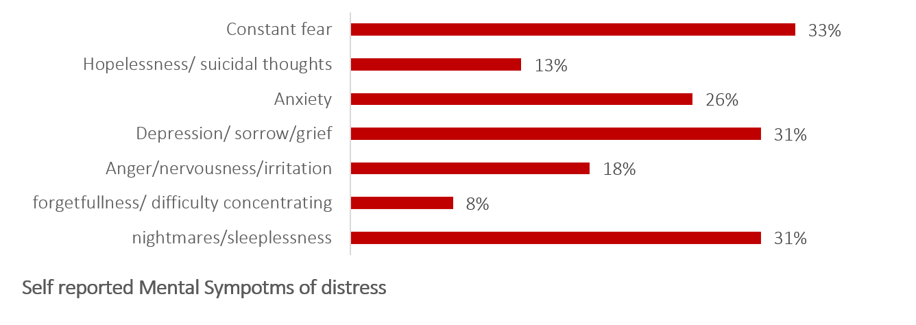 The protection monitoring survey paints a devastating mental health crisis, with Palestinians in Gaza describing feelings of constant fear (33 percent), depression (31 percent), sleeplessness and nightmares (31 percent), and anxiety (26 percent). In 13 percent of cases, respondents described feelings of hopelessness and suicidal thoughts. At least five people showed signs of traumatic stress. One male respondent stated (Khan Younis, 12 July): "I can’t stop thinking about what I saw: Tanks in the streets, people running, tents burning, children screaming. It’s stuck in my head. I keep replaying it over and over. Even now, I jump at every loud sound.”