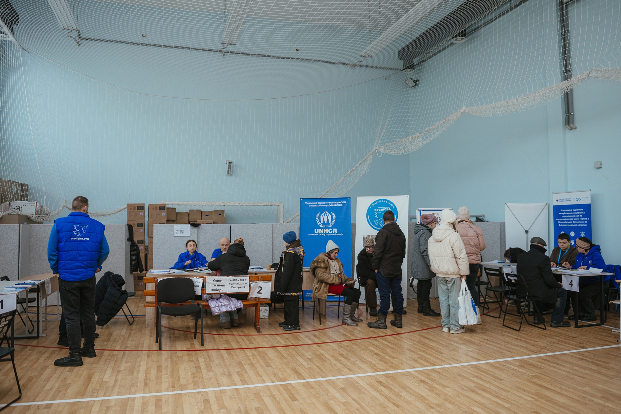 Inside the sports hall, directly on the basketball court, representatives of more than 40 organisations are ready to help. They provide legal, psychological, and protection assistance. Visitors can receive hygiene kits, basic necessities and food. Doctors and a medical team also provide free medication.