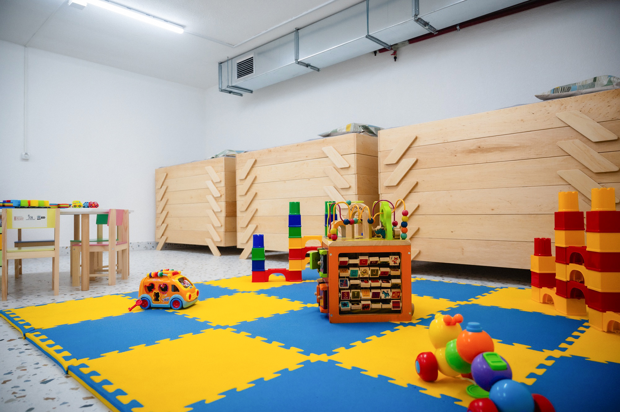 The shelter’s space is designed to be flexible, allowing kindergarten staff to quickly adapt the rooms to meet the children's needs. Mobile cots can be arranged for sleeping or put way to organise group activities or drawing sessions for the children.