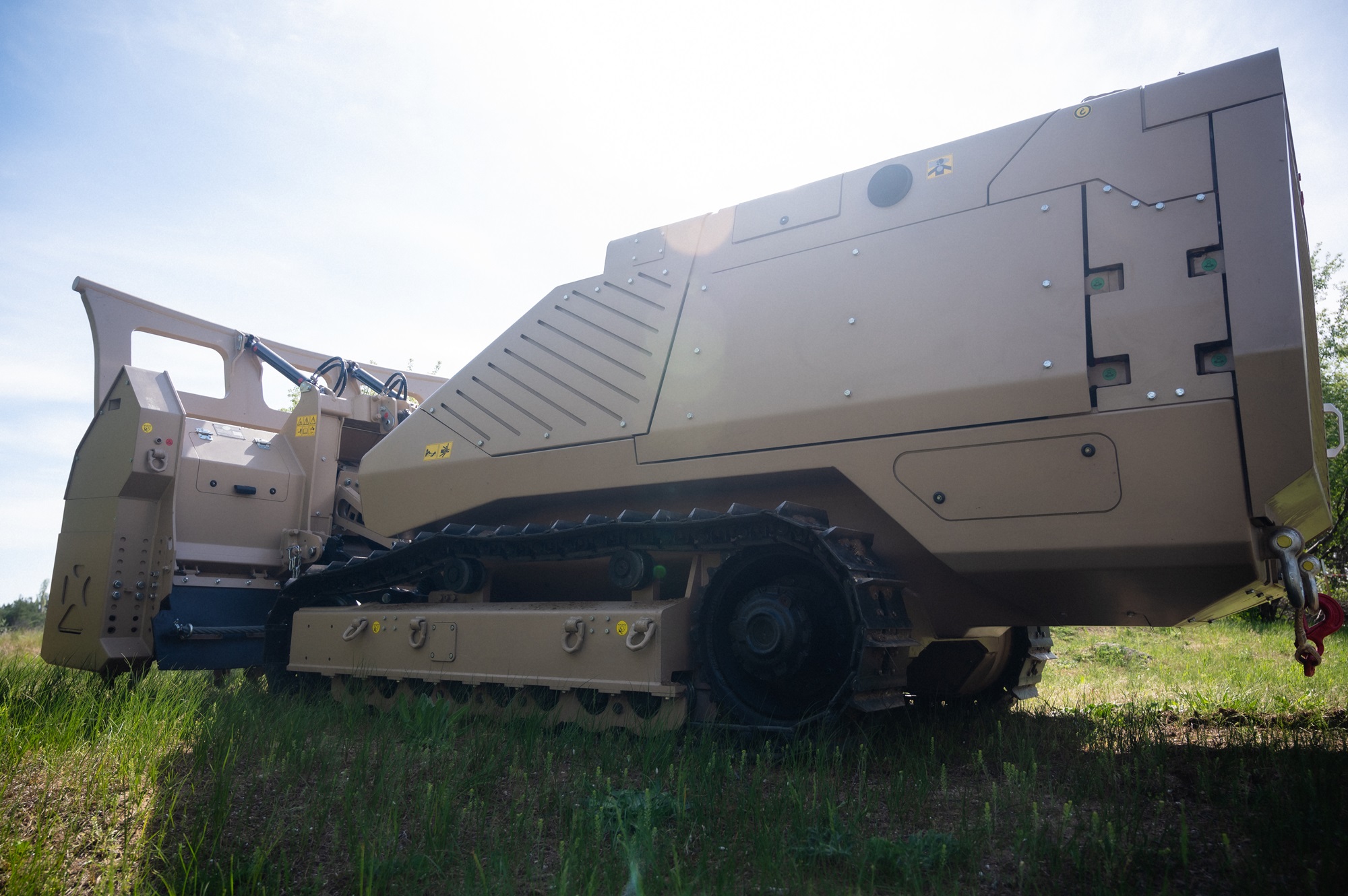 The machine is remotely controlled and can clear up to 12,000 m² per day, which is 200 times more than a group of deminers that clear about 60 m² per day.