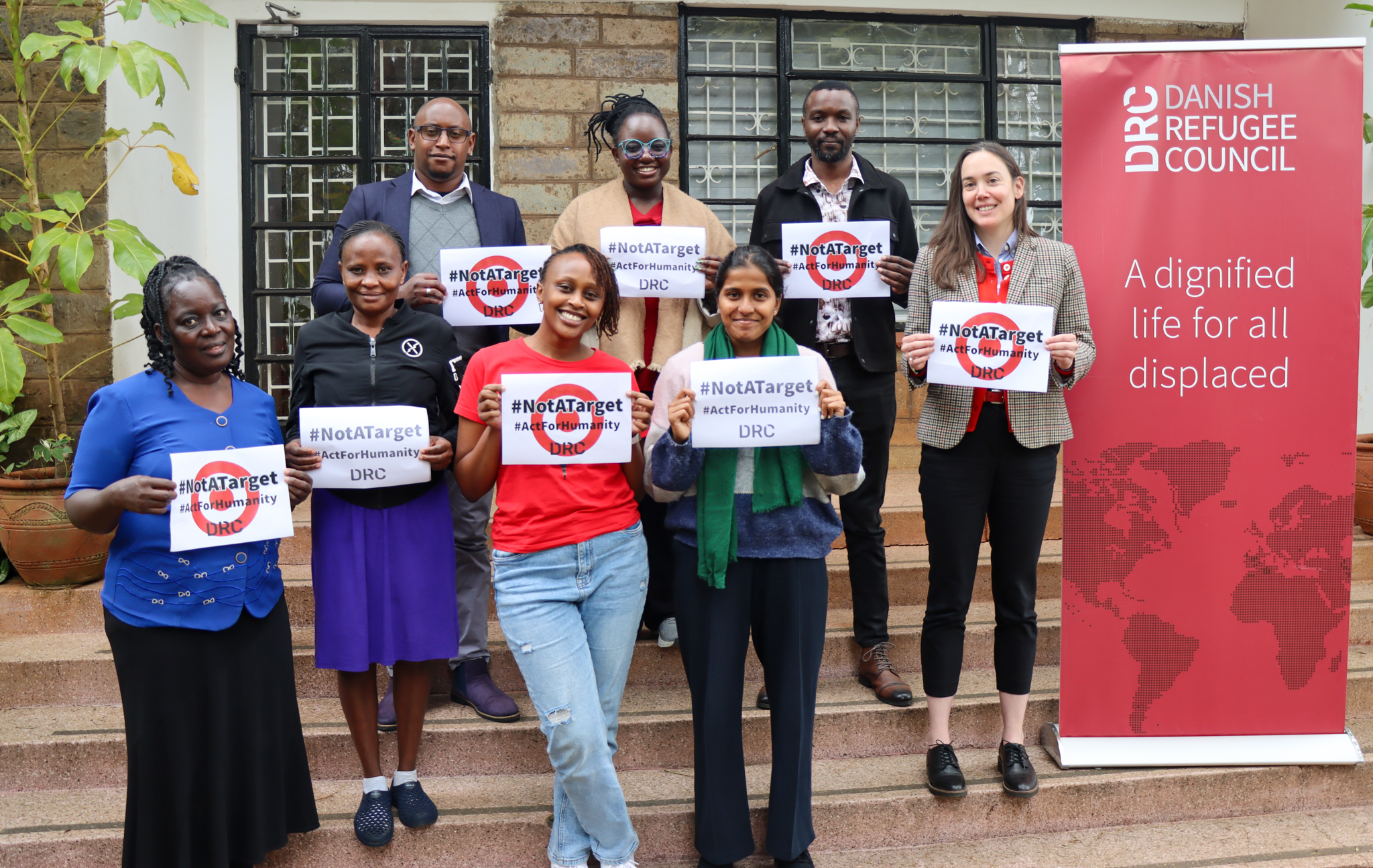 Figure 1:DRC EAGL staff at the regional office in Nairobi show solidarity for World Humanitarian Day 2025 with #NotATarget and #ActForHumanity posters. Photo: Tawakal Aden
